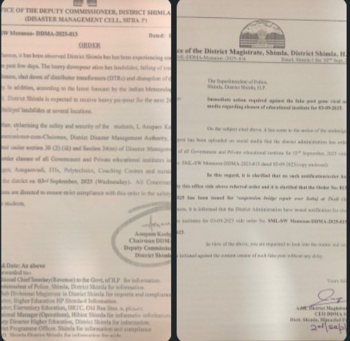Meanwhile, panic spread across Shimla after a fake notification regarding extended school holidays went viral on social media. Speaking to HimbuMail, DC Anupam Kashyap dismissed it outright and shared the original notification.