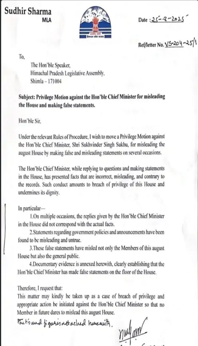 Sharma submitted a formally signed written letter to Speaker Kuldeep Singh Pathania, alleging that the Chief Minister has repeatedly misled the House.